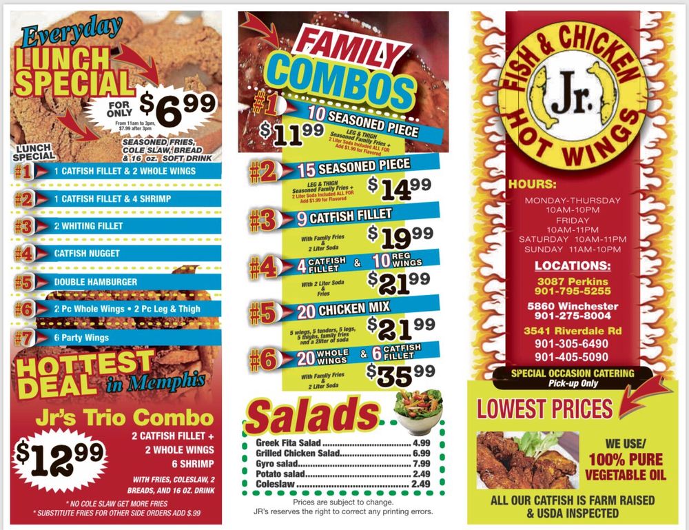 Welcome to Jr's Fish and Chicken, a culinary gem located at 5860 Winchester Rd in Memphis, TN. Specializing in American seafood, this eatery brings the vibrant flavors of fried fish and chicken right to your table. With a reputation for fresh and hearty portions, this spot is a must-visit for seafood lovers and fried food aficionados alike.